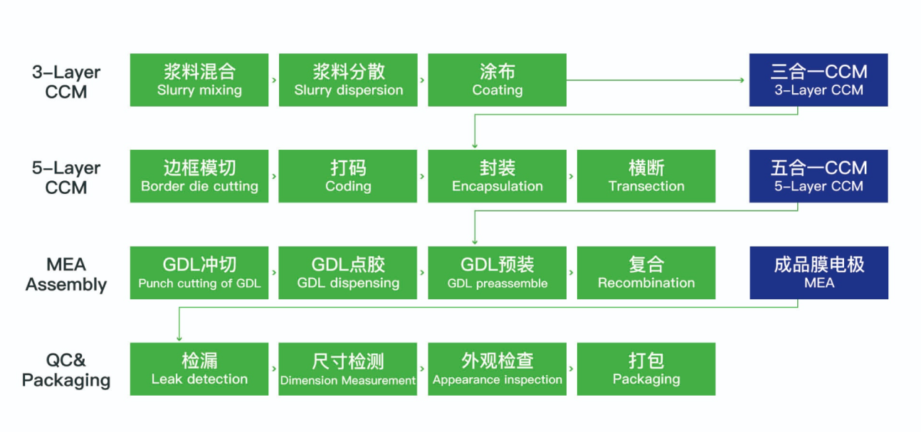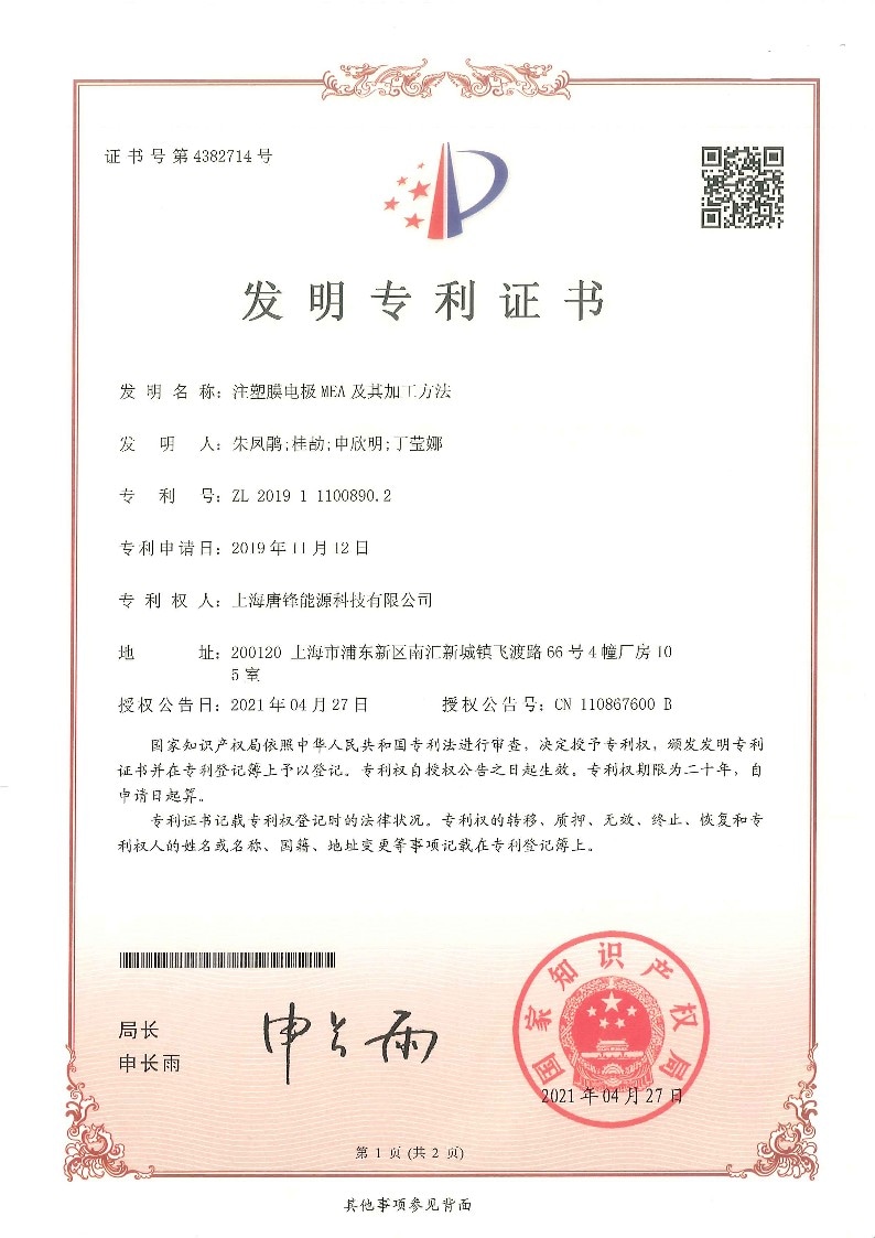 唐鋒能源自主開發(fā)的柔性五合一封裝、七合一組裝的自動化設備;建成了國內首條用于量產(chǎn)燃料電池汽車的低鉑合金膜電極生產(chǎn)線,通過IATF16949認證。